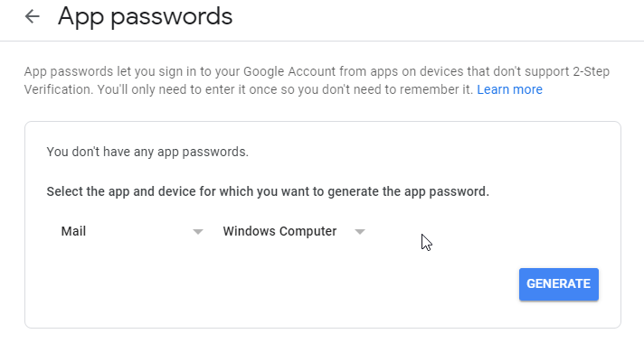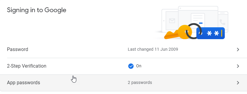 4. Click on App Passwords to generate the app password (Need to enable 2-Step Verification first).