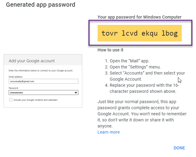6. Click on Generate to generate the App Password and you will get as follows