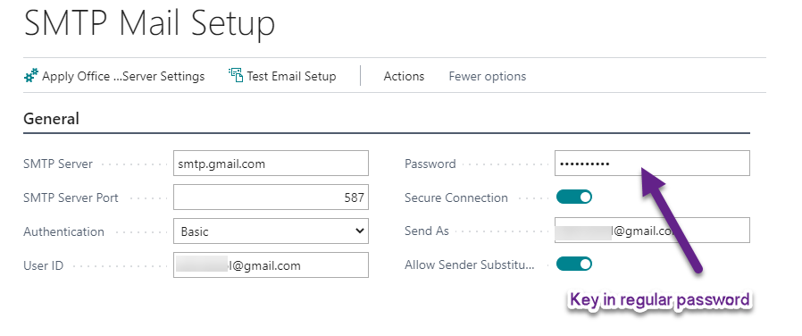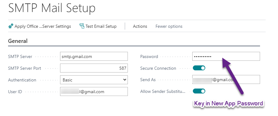 Now go back to business central SMTP Setup and key in this App password instead of regular passwords.