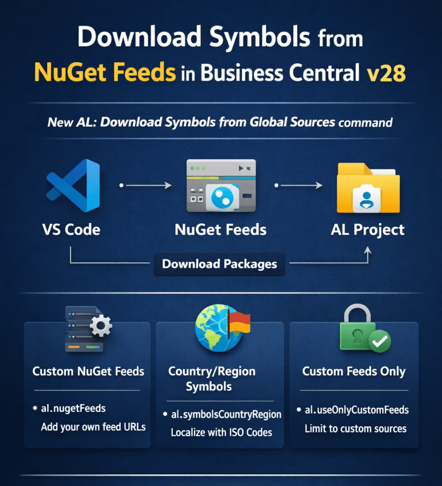 In Business Central 2026 release wave 1 (v28), Microsoft introduced a powerful enhancement for AL developers — the ability to download symbols directly from global NuGet feeds.